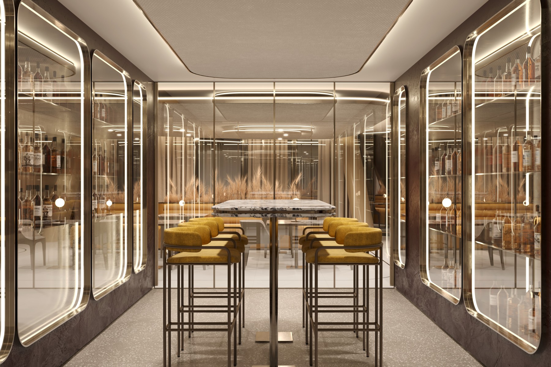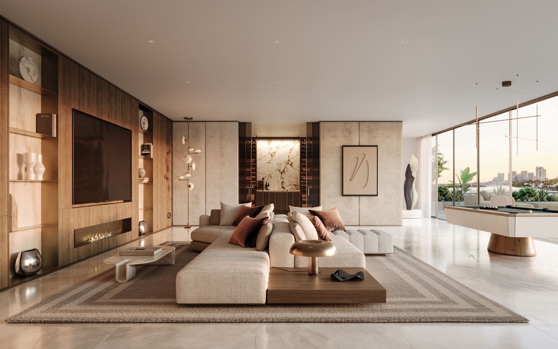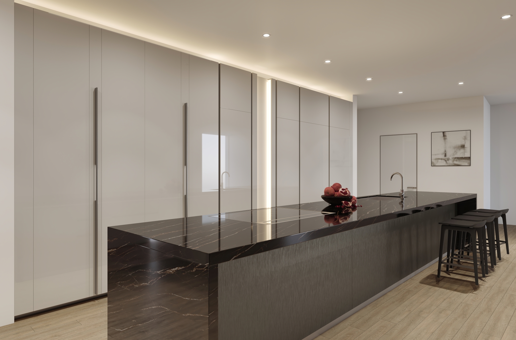 - LED dim-to-warm recessed down lighting throughout units is controlled by a centralized system for customizable lighting scenarios