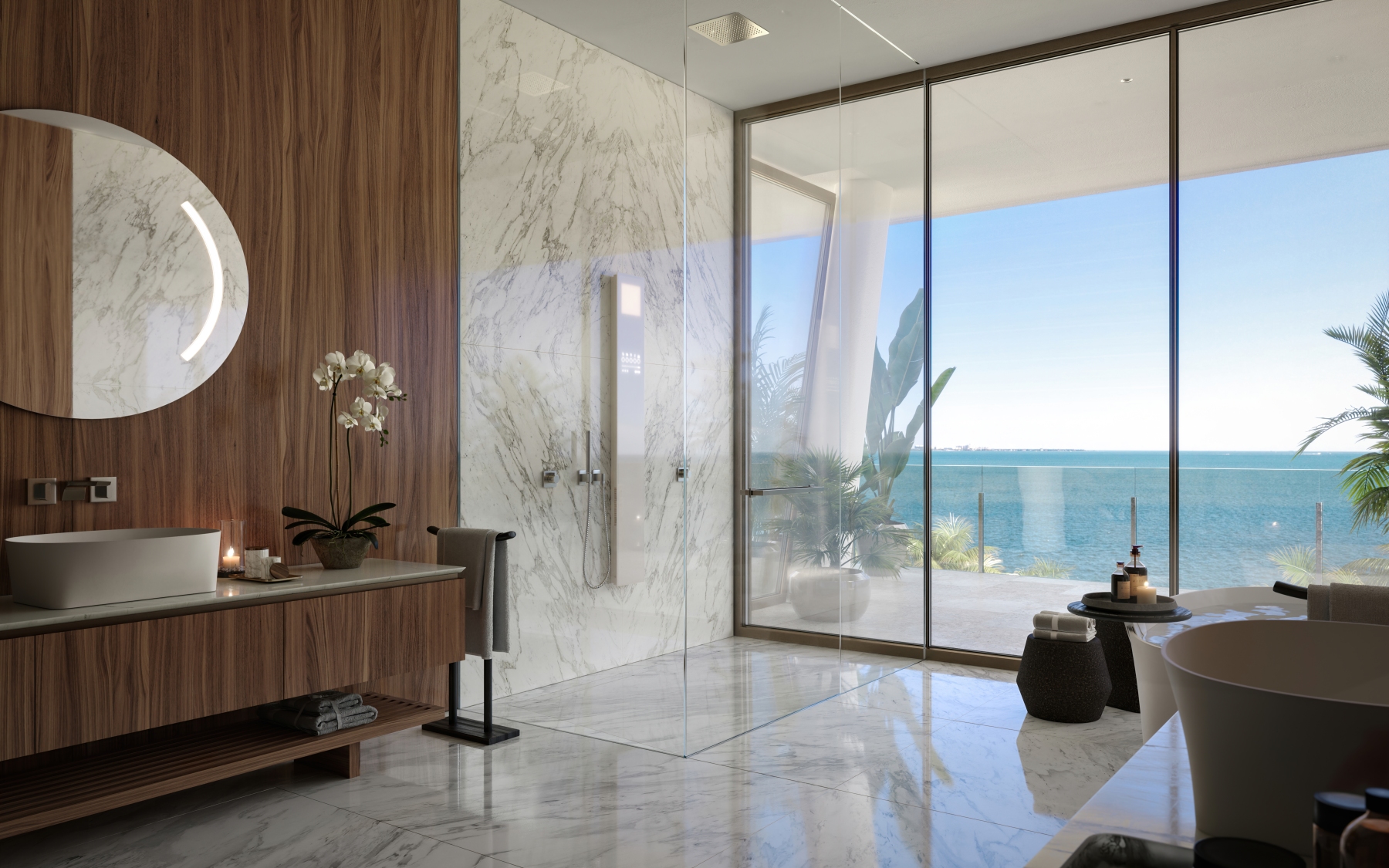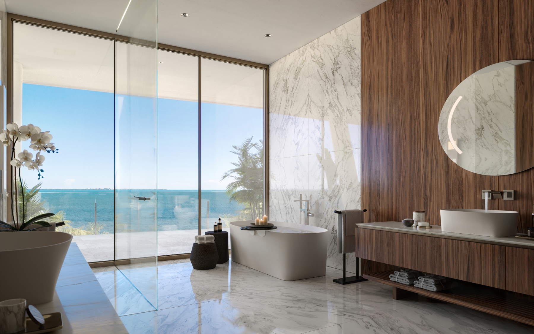 - Master bedrooms, master bathrooms, and living areas all face spectacular unobstructed water views and feature the finest in book-matched Italian marble